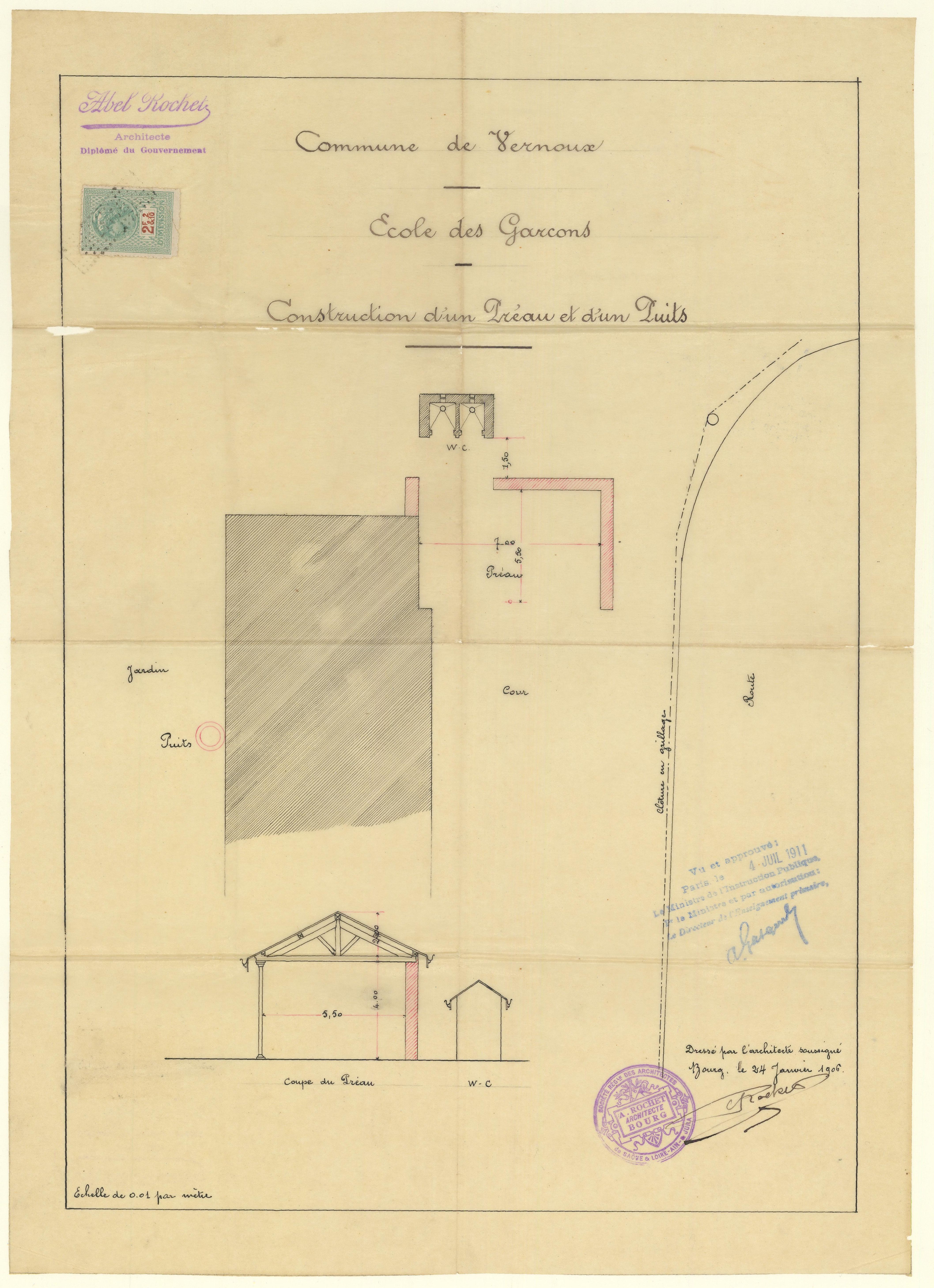 Plan pour la construction d'un préau et d'un puits à l'école des garçons dans le cadre des travaux d’appropriation des écoles (1er projet), vue 01.